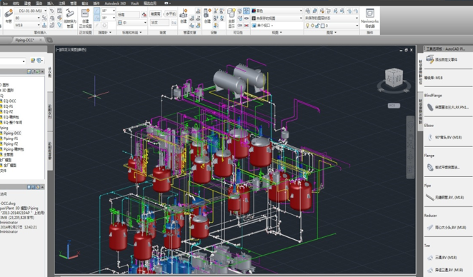 對(duì)整個(gè)廠房的三維模型進(jìn)行剖切以查看內(nèi)部情況。此圖給出了廠房側(cè)面的一個(gè)剖分 視角??梢园l(fā)現(xiàn):建筑結(jié)構(gòu)、設(shè)備尺寸與就位位置、工藝管道和閥門的布局與連接、 暖通系統(tǒng)、消防管道等各個(gè)專業(yè)的信息全部綜合在了一個(gè)三維模型中。將檢查碰撞的 工作在前期設(shè)計(jì)過(guò)程中就全部解決,對(duì)潛在問(wèn)題變得可遇見(jiàn)。大幅提高了規(guī)劃設(shè)計(jì)的 嚴(yán)謹(jǐn)性和工程施工的科學(xué)性。